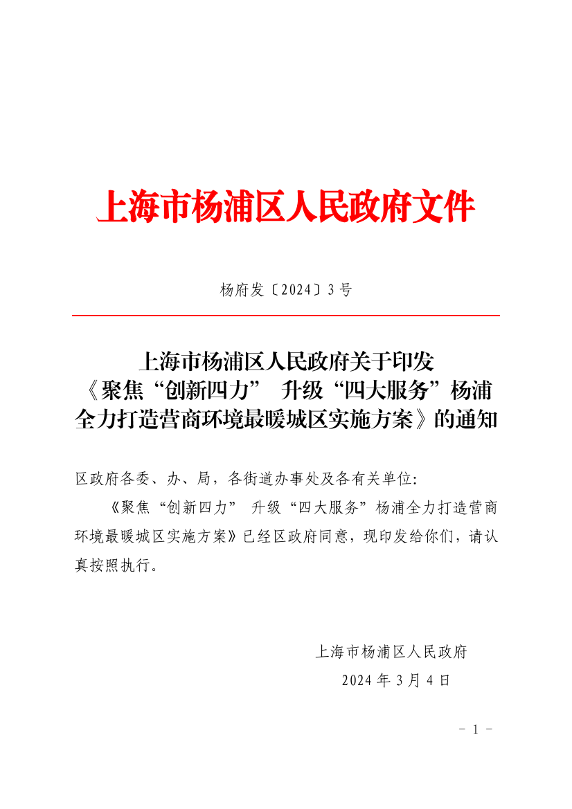 ??《聚焦“創(chuàng)新四力” 升級(jí)“四大服務(wù)”楊浦全力打造營商環(huán)境最暖城區(qū)實(shí)施方案》已經(jīng)區(qū)政府同意,現(xiàn)印發(fā)給你們,請認(rèn)真按照執(zhí)行。