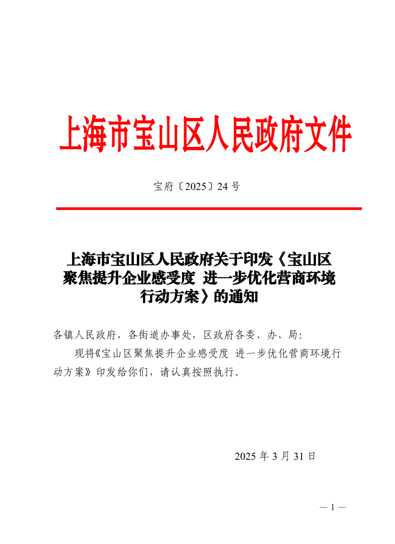 ??現(xiàn)將《寶山區(qū)聚焦提升企業(yè)感受度 進一步優(yōu)化營商環(huán)境行動方案》印發(fā)給你們,請認真按照執(zhí)行。
