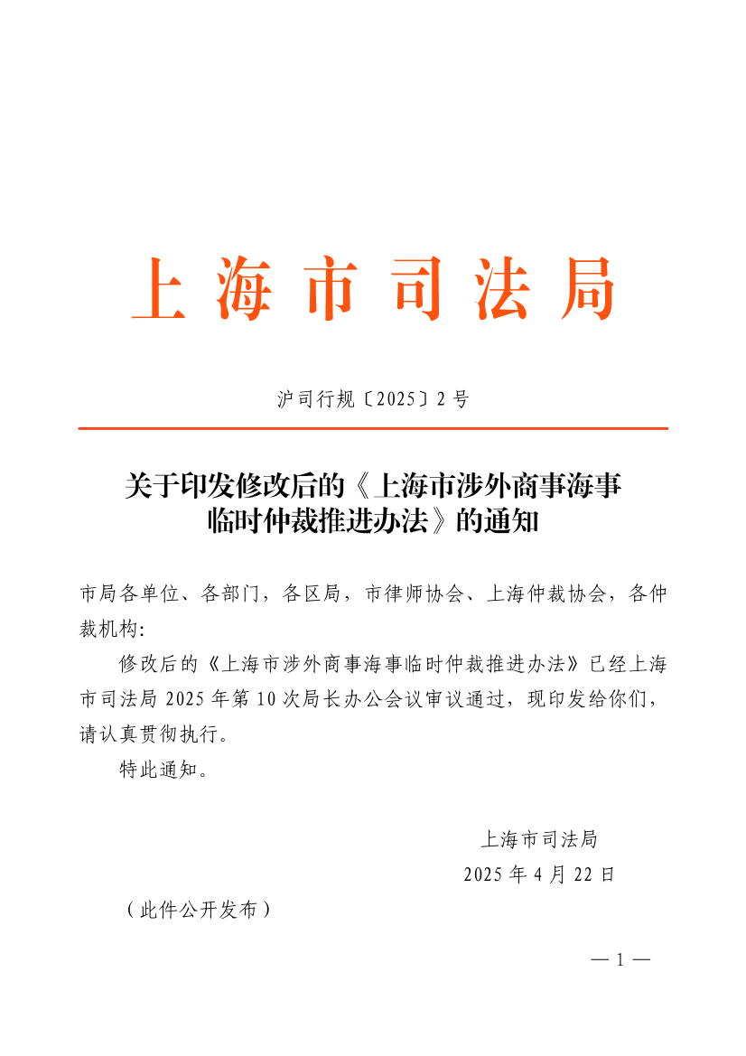 ??修改后的《上海市涉外商事海事臨時仲裁推進辦法》已經(jīng)上海市司法局2025年第10次局長辦公會議審議通過,現(xiàn)印發(fā)給你們,請認真貫徹執(zhí)行。