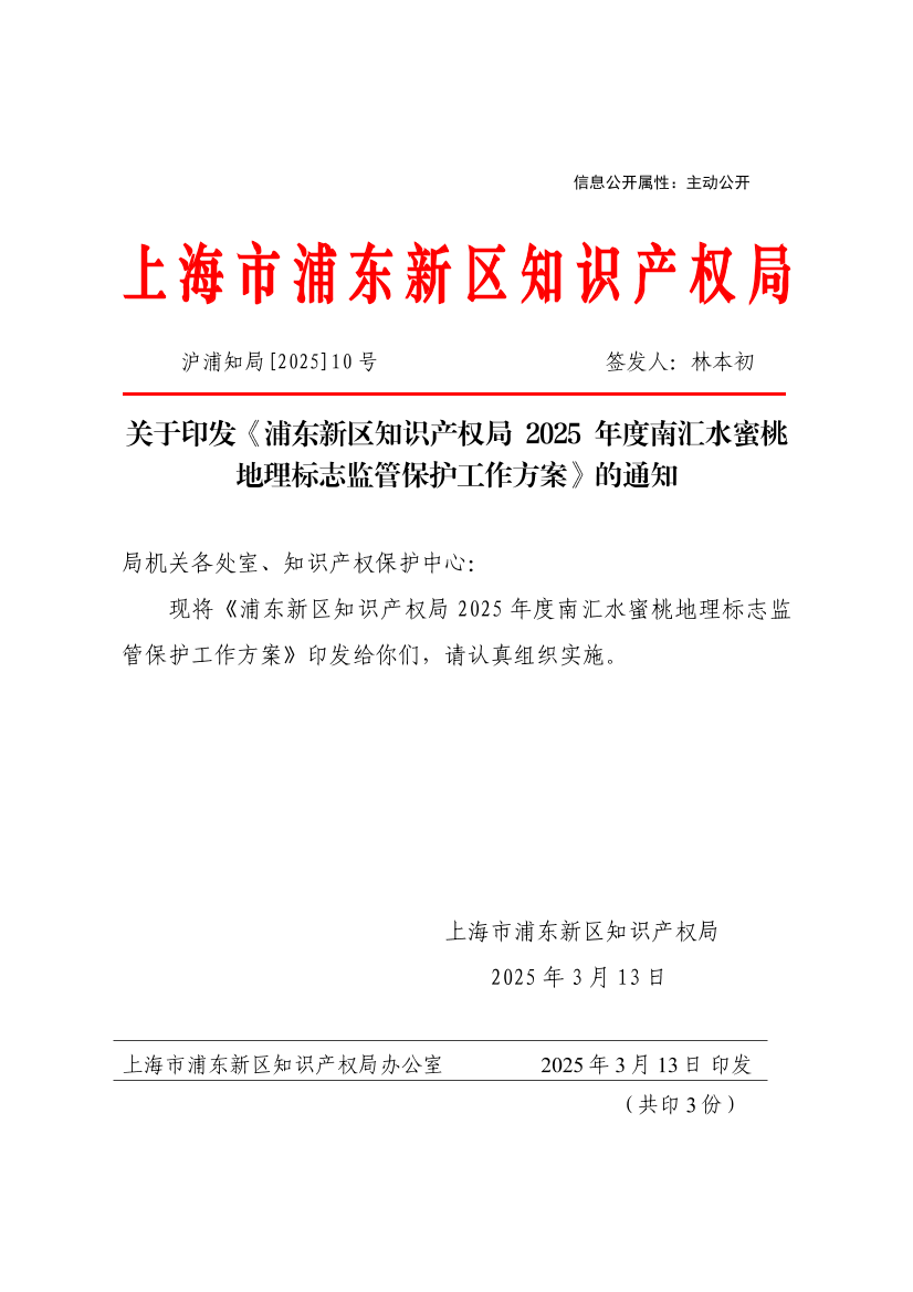 ??現將《浦東新區(qū)知識產權局2025年度南匯水蜜桃地理標志監(jiān)管保護工作方案》印發(fā)給你們,請認真組織實施。