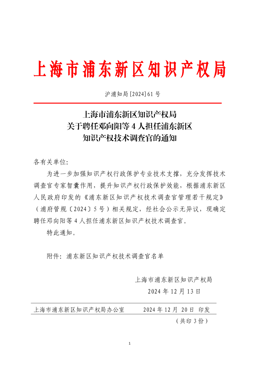 ??為進(jìn)一步加強(qiáng)知識(shí)產(chǎn)權(quán)行政保護(hù)專(zhuān)業(yè)技術(shù)支撐,充分發(fā)揮技術(shù)調(diào)查官專(zhuān)家智囊作用,提升知識(shí)產(chǎn)權(quán)行政保護(hù)效能,根據(jù)浦東新區(qū)人民政府印發(fā)的《浦東新區(qū)知識(shí)產(chǎn)權(quán)技術(shù)調(diào)查官管理若干規(guī)定》(浦府管規(guī)〔2024〕5號(hào))相關(guān)規(guī)定,經(jīng)社會(huì)公示無(wú)異議,現(xiàn)確定聘任鄧向陽(yáng)等4人擔(dān)任浦東新區(qū)知識(shí)產(chǎn)權(quán)技術(shù)調(diào)查官。