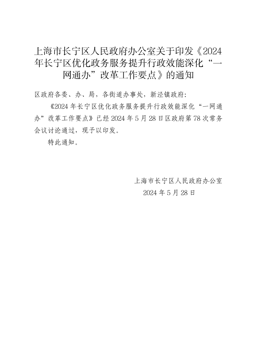 上海市長寧區(qū)人民政府辦公室關于印發(fā)《2024年長寧區(qū)優(yōu)化政務服務提升行政效能深化“一網(wǎng)通辦”改革工作要點》的通知